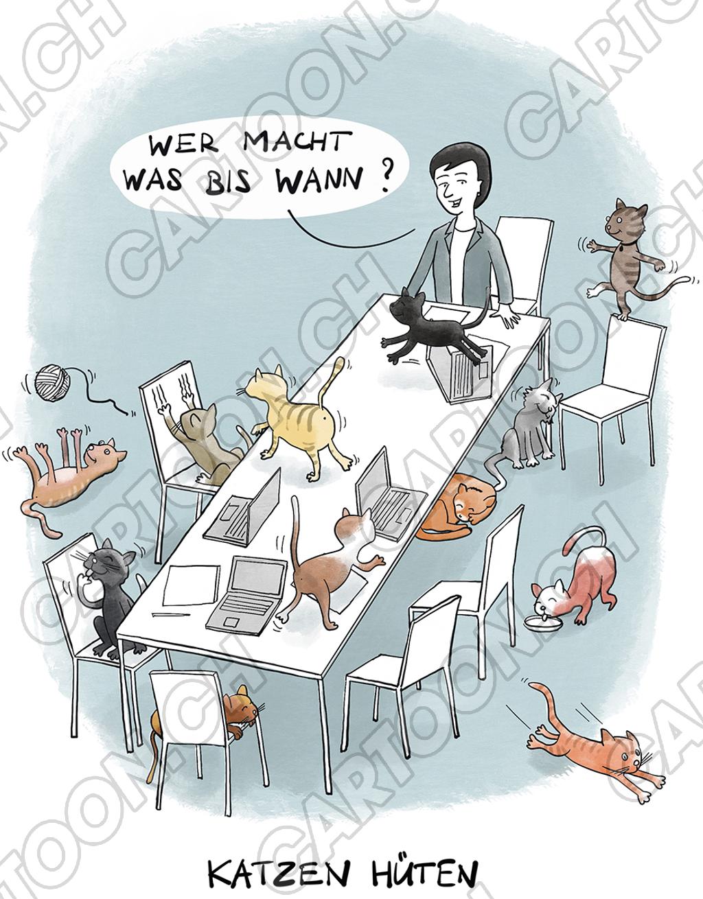Tags: Büro Projekt Kommunikation Teamwork Team Sitzung Meeting Organisation Office Leadership HR Human resources Herding Cats Katzen hüten Chaos Besprechung