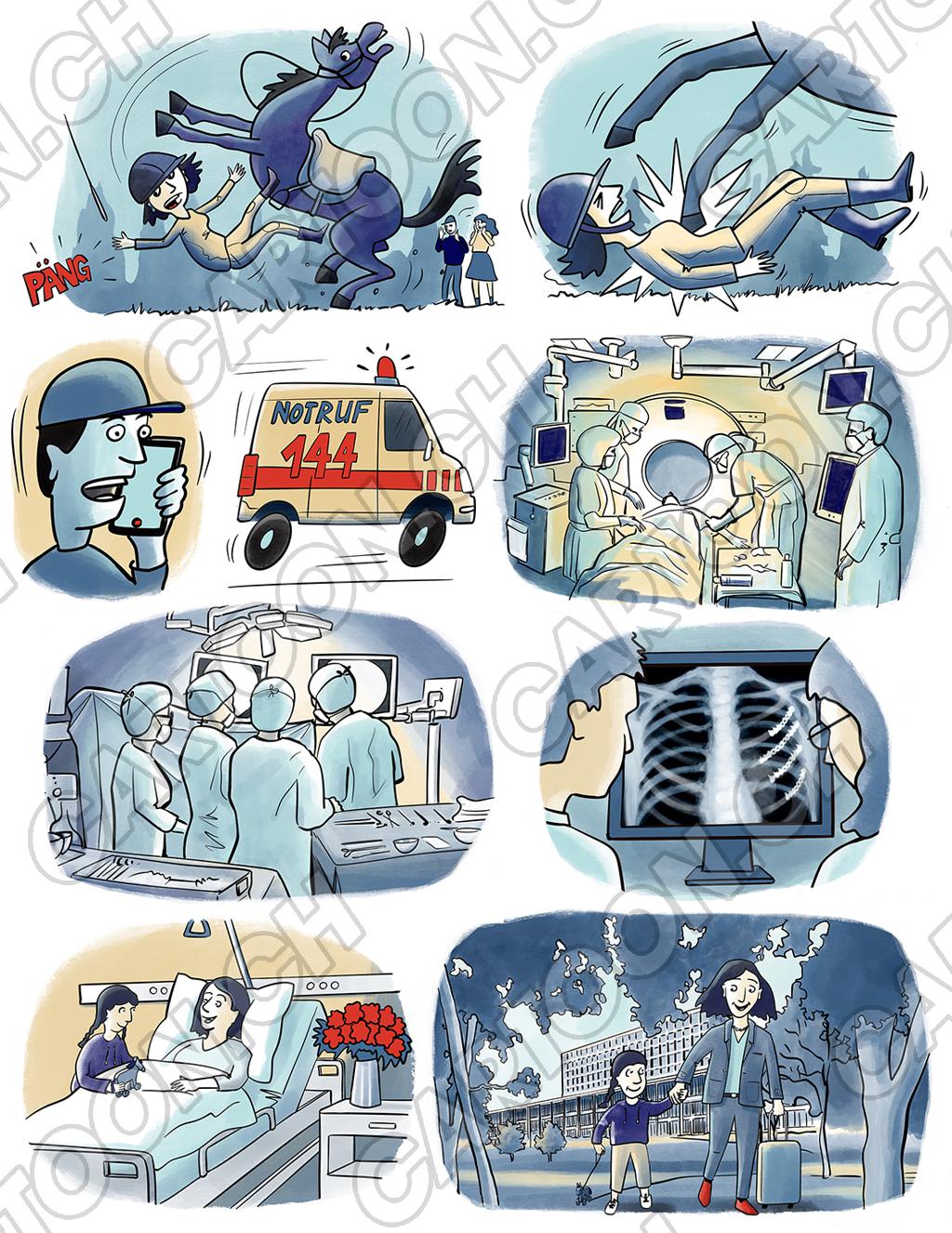 Tags: Illustration Kommunikation Gesundheit Comic Medizin Spital Unfall Pferde Gesundheitswesen Infografik Operation story