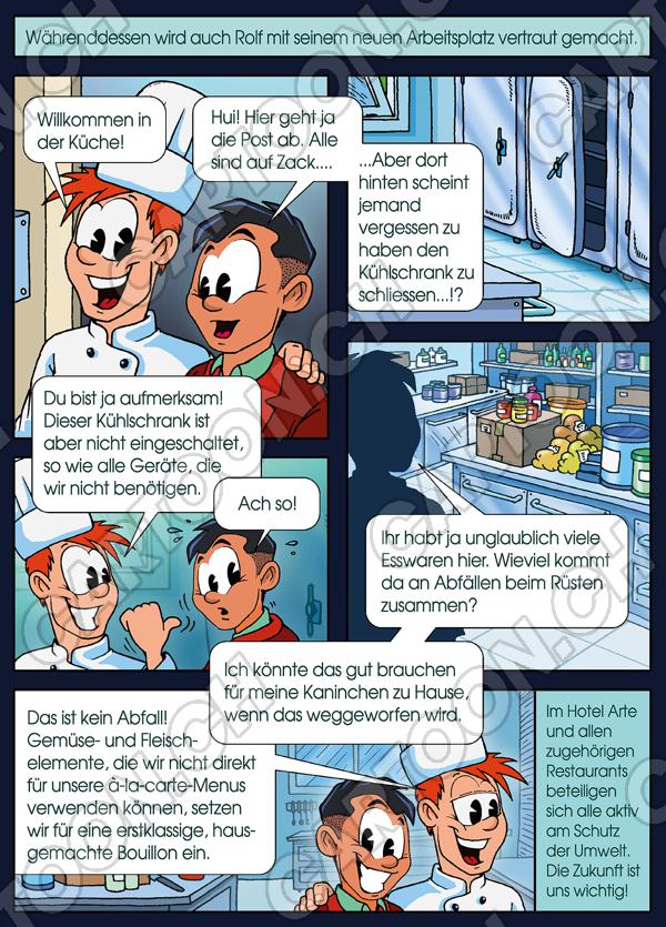 Tags: Mitarbeiter Hotel Gastronomie Geschichte Küche Koch Lehrling Comic Story Bildgeschichte Storytelling Angestellte Lehrtochter Ausbildung Umweltschutz Umwelt Ökologisch