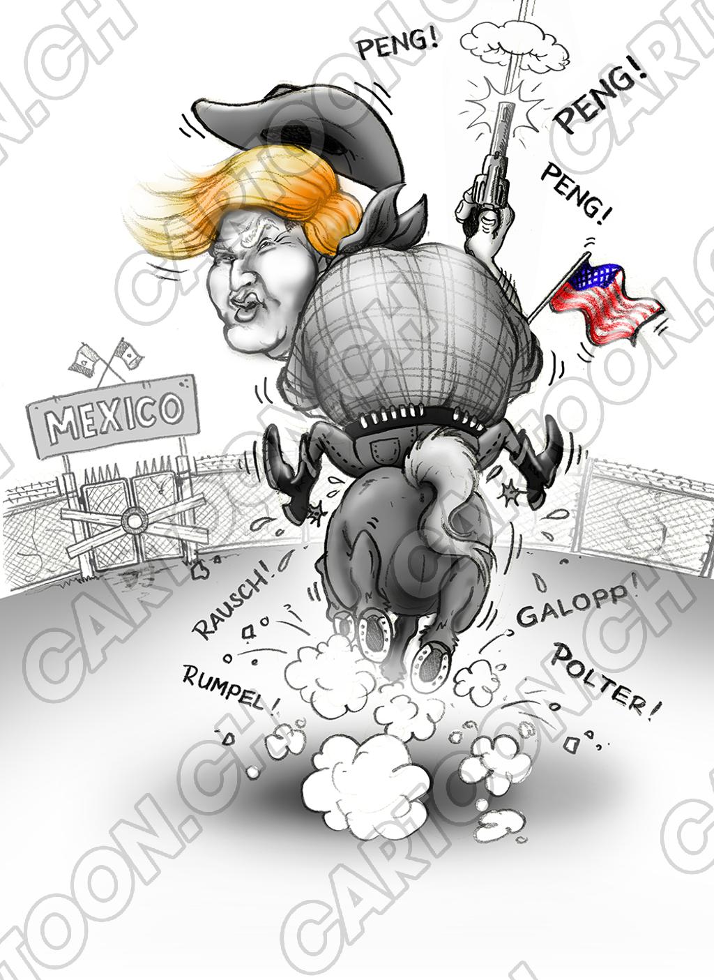 Tags: USA Donald Trump Amerika Karikatur Politik Mexiko Grenze Cowboy Pferd Reiten Pistole Peng
