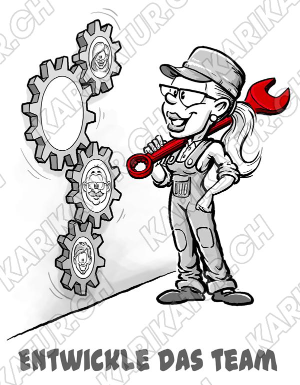 Tags: Zahnrad Getriebe Visualisierung Character Figur schwarz weiss schwarzweiss Cartoon Mechaniker Frau Comic Comicfigur Team leitsatz DNA Motto Girl Dame Maschine Funktionieren Teambildung Teamentwicklung entwickle das Team Teamgeist teamorientiert Warten reparieren Schraubenschlüssel