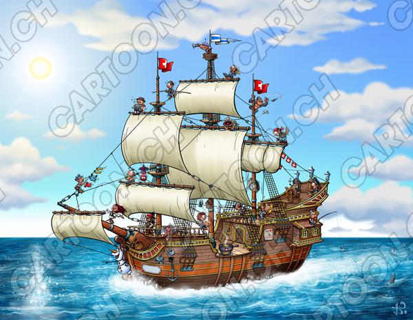 Tags: Schweiz Wimmelbild Details Schiff Cartoon lustig farbig Figuren Meer bunt Wasser Segelschiff Kapitän Piraten Hai Piratenschiff Sonne Segeln Wimmeln Spiderman Jack Sparrow Matrose Olaf Gallionsfigur Masten Dreimaster Fregatte